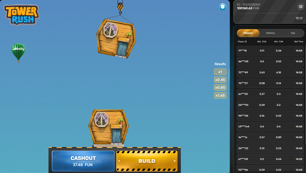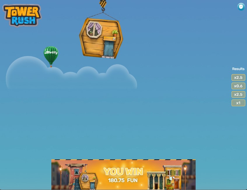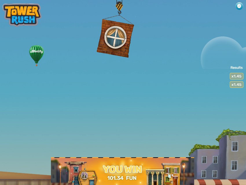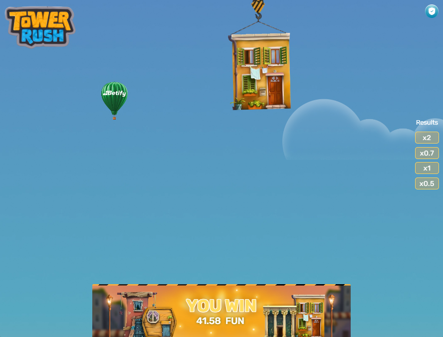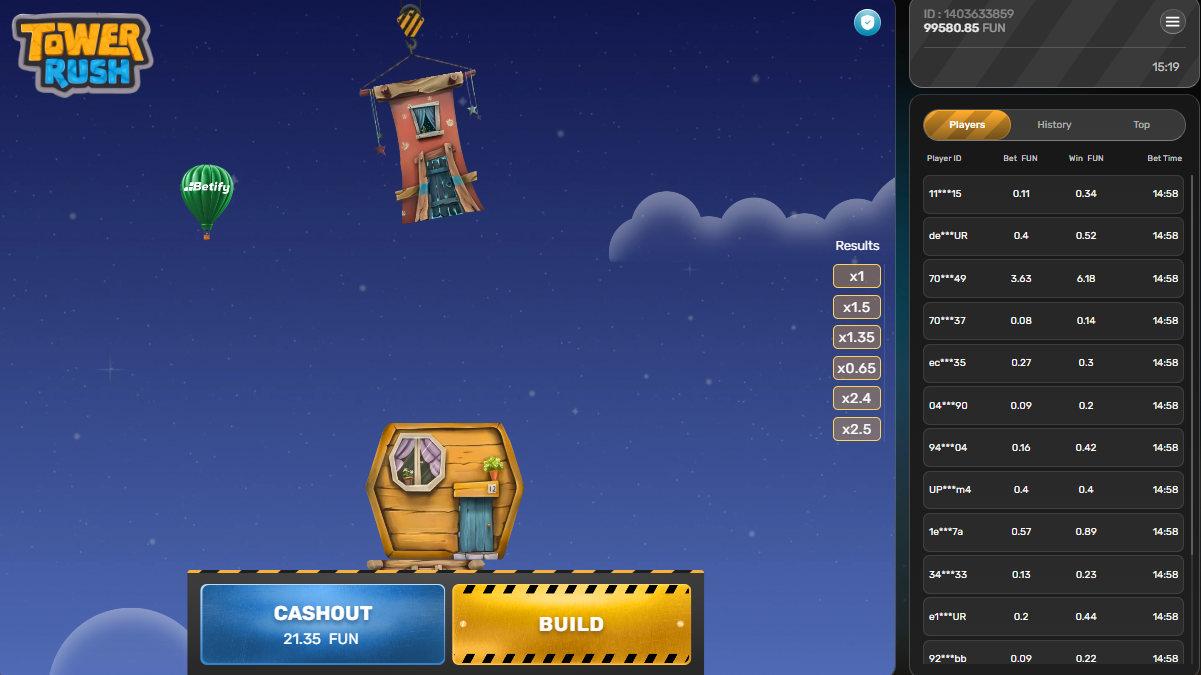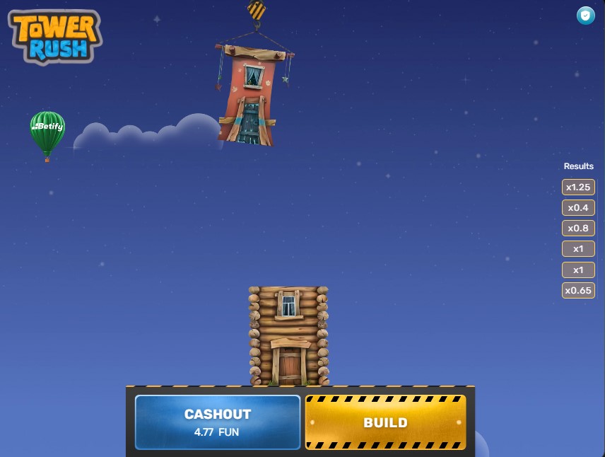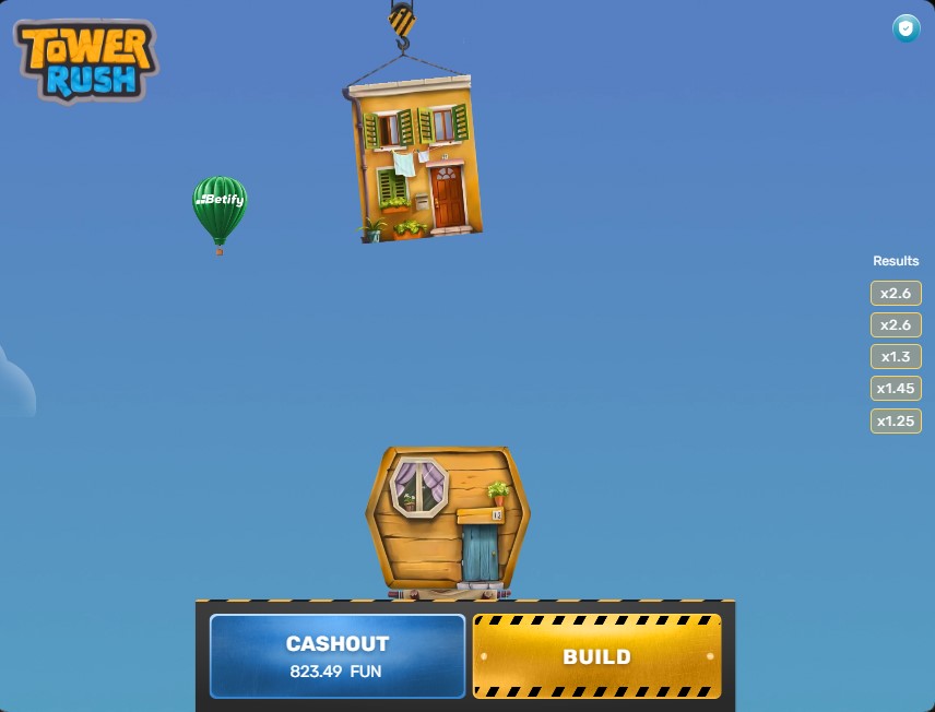 Po ustaleniu stawki kliknij żółty przycisk „BUILD” w prawym dolnym rogu ekranu. Domek zaczyna się kołysać nad wieżą, musisz wyczuć właściwy moment i ponownie nacisnąć BUILD, by go upuścić. Jeśli domek trafi prosto na poprzedni, mnożnik rośnie. Jeśli spadnie obok, tracisz stawkę i całość zgromadzonych zysków.